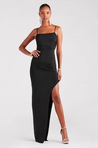 - Side ruched seams, high side slit, floor-length hem