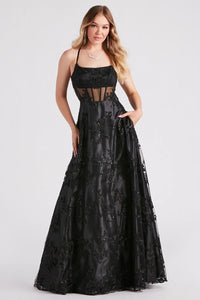 Wow them all with your gorgeous allure in the show-stopping Monica sequin lace ball gown. She features a sleeveless square neckline with a lined bust, a sheer mesh bodice with flexible boning to provide structure, spaghetti straps, and a bold open back with a cross-back strap design. Her fitted high waist flows out to a floor-sweeping hem with a dramatic ball gown silhouette and includes side pockets for a stylish touch. The sheer mesh fabric includes a partial satin woven lining, a tulle lining, and features a luxe floral lace embroidered design with sequin detailing to catch the light. Complete your look with rhinestone fringe earrings for prom or a fancy gala!