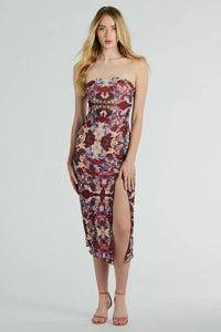 Botanical Beauty Lace Trim Floral Satin Midi Dress