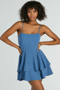You'll look positively cute and divine in this short skater dress at brunch or graduations! Designed with a flattering square neckline, adjustable spaghetti straps for the perfect fit, and a tie-back design, this dress is perfect for every girlie. The skater silhouette and ruffled layer add a playful touch, while the short-length hem offers comfort and versatility. Complete the look in strappy mules.