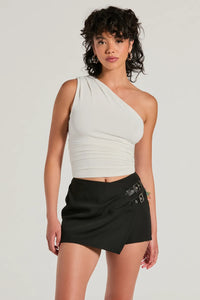 The perfect sleeveless crop top to groove in at parties! Featuring a trendy one-shoulder neckline and figure-flattering side ruched seams, this top is perfect for any occasion. The cropped hem adds a touch of sass to this must-have top. Complete the look in high-rise jeans.