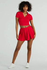 Game set and match! This mini skort is in it for the win. It features a high-rise waist a trendy pleated silhouette, and a mini-length hem on stretchy rib knit fabric. Complete the look with the matching top.