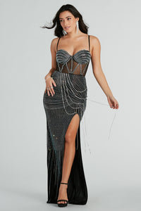 The Lorette formal long dress brings the glam factor with gorgeous rhinestone embellishments to make your mark at prom or red carpet events! She features a sweetheart neckline, adjustable spaghetti straps, and a sheer bustier bodice and padded bust adorned with rhinestone embellished striped trim for a touch of sophistication. The slim silhouette, high front slit, and five-side rhinestone swag chains create a statement-making look. Made from rhinestone embellished mesh fabric with a full knit stretchy lining, this dress is a work of art! Complete the look in platform heels.