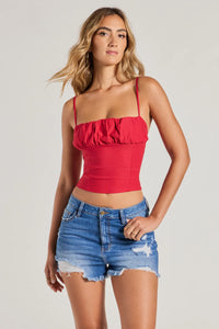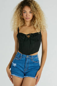 Play it your way in this linen corset top to draw all the attention! Made from a linen blend fabric lined with knit perfect for the warmer weather ahead. With a sweetheart neckline and adjustable straps, the ruched bust and tie-front add a touch of charm. The flexible boning provides support while the cropped hem back hook and eye fasteners give a flattering fit. Complete the look in high-rise jeans for day or night plans!