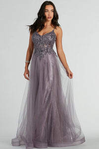 Enter any event in blissful and gorgeous style in this Vanessa A-line glitter tulle formal dress to captivate hearts at balls, galas, and prom! Luxurious tulle fabric with glitter tulle and satin woven linings accent exudes elegance on this gown. Her V-neckline and beaded sequin applique add a touch of glamour, while the adjustable spaghetti straps and padded bra cups provide a perfect fit. The A-line silhouette and floor-length hem create a stunning shape for this gorgeous dress. Complete the look with earrings and dressy heels.