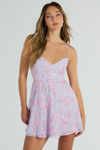 Indulge in the ultimate feminine look in this floral skater dress for parties and dressy occasions! Featuring a delicate V-neckline, spaghetti straps, and a figure-flattering lace-up design, this dress is perfect for any event. The skater silhouette and short-length hem add a touch of playfulness, while the intricate floral embroidery adds a romantic and elegant touch. Complete the look in fringe earrings and heels!