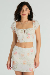 Give off the prettiest vibe in this floral woven crop top perfect for the season. Designed with a lightweight woven fabric, it features a subtle rose print pattern for a sweet feminine flair. The top is shaped with a ruched sweetheart neckline with a tie-front design at the bust, short puff sleeves with adorable ruffled hems that can be worn off the shoulder, flexible boning at the bodice for added structure, and a fitted cropped hem. Style with the matching mini skort for a cute brunch look!