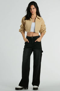 Elevate your look with this versatile and trendy crop bomber jacket! Made from twill woven fabric, the cinched elasticized crop waist adds a stylish touch while keeping you comfortable. Designed with classic long sleeves with button cuffs, a collar neckline, side pockets, and a front zipper closure. Complete the look in cargo pants for a casual hang.