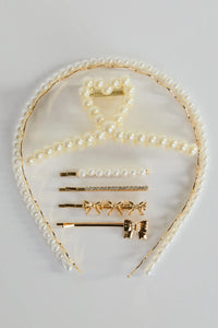 Elevate your hair game with this must-have hair accessory set! This set includes a faux pearl headband, squiggle headband, faux pearl heart hair clip, and four bobby pins in different styles. Add a touch of elegance to your daily look and effortlessly elevate your style! Complete the look in cute heels for any semi-formal or dressy soiree!