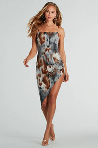 Play up your going-out look adding an artsy vibe with this abstract midi dress! The stretchy knit fabric showcases a trendy abstract print for that cool-girl aesthetic. The mid-length dress features a sleeveless square neckline and spaghetti straps, ruched detailing down the side seam to accentuate your curves on the bodycon silhouette, and a high-cut asymmetric hem creating a sultry slit. Style with clear heels for a rooftop bar.
