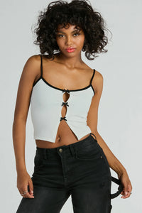 This crop top brings feminine flair to your croquette-inspired look! Crafted from soft rib knit stretchy fabric, this sleeveless tank top boasts a contrast trim scoop neckline and adjustable spaghetti straps for a perfect fit. The front satin bow decor highlights your flirtiness with cutout accents and a slit. Complete the look in a ruffled mini skirt for casual hangs.