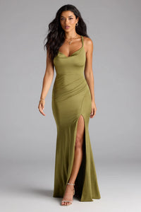 Effortlessly command attention in the Fabienne mermaid formal dress designed with a sultry open back and a high front slit that flaunts your heels of the night!