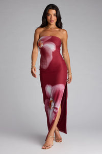 All eyes on the floral. This strapless maxi dress turns up the heat with a bold bloom moment and a high side slit that knows how to make an entrance at parties and on vacay!