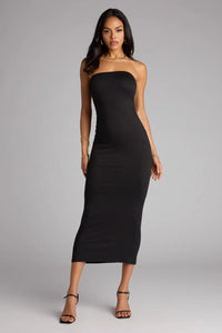 Steal the scene and leave them speechless. This sleek strapless midi hugs your curves with a smooth, sculpted fit perfect for date nights, parties, or whenever you’re feeling that girl energy.
