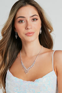 Shimmer with a dreamy iridescent shine in this rhinestone necklace and earrings set! This luxe jewelry set features a V-shaped collar necklace with a single row of rhinestones leading to two rows of rhinestones and a gorgeously detailed design of rhinestone marquise-shaped outlines. The short drop earrings feature a matching rhinestone design. Style with a glitter clutch to complete your gorgeous formal look.