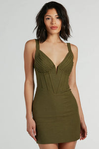 This linen mini dress was made for your next getaway! Imagine strolling around the island or Hamptons in this sassy dress featuring a sultry plunge V-neckline with a wired insert for structure, a pleated underwire bust that flatters, flexible boning for a snatched look, and a bodycon silhouette and mini-length hem. Complete the look in sandals and sunnies!