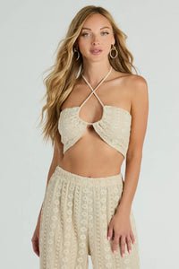 This crochet crop top was meant for living under the sun! Whether you're heading to a festival or a getaway, this top will keep you boho-cute. It features a sultry halter neckline with a spaghetti strap tie and an ultra-cropped hem to flaunt your figure. Complete the look with the matching pants.