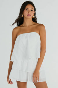 The perfect strapless romper for hanging poolside on vacay and get ready to make a stylish splash! With a strapless ruffled neckline and slit open-back detail, this romper is perfect for soaking up the sun. The stretchy smocked waistband and flowy hem add comfort and style, while the gauze woven fabric keeps you cool. Complete the look in sunnies.