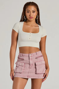 Level up the cool factor of your look with this cargo denim mini skirt! Made with a cotton denim fabric, this skirt offers a structured rigid fit with no stretch. It features a high waist, a mini-length hem, and a form-hugging fit to flaunt your figure. Includes zippered faux pockets, large cargo flap pockets, back faux pockets, belt loops, and a front button with a hidden zipper closure. Style with a crop top and sneakers.