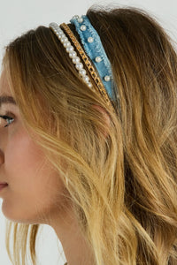 Add a finishing look to your tresses with this three-piece headband set! The set includes a denim headband with faux pearl embellishments, a chain link metal headband, and a faux pearl headband. Style with an adorable shoulder purse for any event!