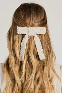 Channel the trendy coquette aesthetic and give your look a girly-glam vibe with this adorable pearl bow hair barrette! It features a chic oversized bow design embellished with faux pearls and small beaded detailing. Includes a metal barrette clip. Style with a skater dress and mules!