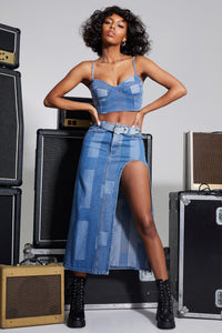 Amp up your fab concert outfit with this trendy high slit patchwork denim maxi skirt! Designed with a faded patchwork pattern on the denim fabric, you'll create that perfect retro look. The skirt is shaped with a high waist leading to a maxi-length hem with a high-cut arched side slit on the slim-fit silhouette for an alluring vibe. Complete your 'fit with the matching bustier top!