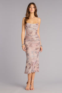 A dress that knows how to flirt back—soft mesh, blooming prints, and a cowl neckline that moves with a little drama. The wrap detail and curve-hugging skirt follow your shape just right, making this your go-to for nights when you want a look that feels effortless yet unforgettable.