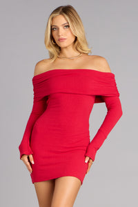 All eyes on you. This off-the-shoulder ribbed mini dress hugs every curve in soft, stretchy knit with a foldover neckline that adds just the right amount of flirt. The long sleeves balance the bodycon fit for a look that’s equal parts cozy and captivating.