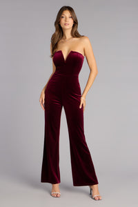 Serve ultra-sleek, ultra-luxe energy in this dreamy velvet jumpsuit. With its sculpted strapless V-plunge neckline and smooth, hip-hugging fit finished with a subtle wide-leg silhouette, this jumpsuit was made for holiday parties, chic dinners, and any dressy affair!