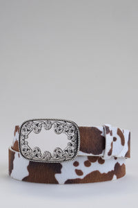 Take your style to new heights in this cow belt! This eye-catching belt features trendy cow print faux fur and is finished with a statement buckle.