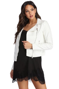 It's all in the zipper details! This moto jacket is a must for a chic and sleek vibe. Layer this jacket for a night out with the squad. The jacket features an asymmetrical zipper front, small zippered pockets, zipper details on the shoulder, a cropped, form-hugging fit, and is composed of faux leather fabric. Complete your look with high waist denim jeans and sleek hoops.