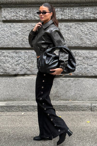 Jeans with a little extra edge—literally. The grommet detailing down the sides takes this wide-leg fit from everyday basic to bold statement, perfect for any plans!