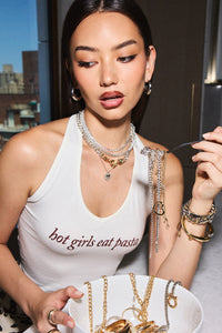 Proof that carbs and confidence go hand in hand. This halter crop top keeps it cheeky with a “hot girls eat pasta” graphic and a fitted vibe that’s ready for your next foodie photo dump.