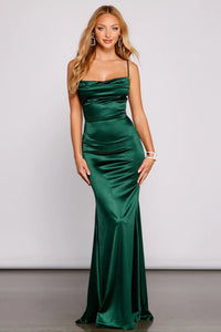 The stunning Nahla dress enchants and brings the charm with her luxe satin and flattering mermaid silhouette to embrace curves! Perfect for prom, she features a sleeveless cowl neckline, adjustable spaghetti straps, and a flared mermaid silhouette. Nahla is composed of a lined satin fabric that offers a form-hugging fit with a moderate stretch. Complete your glamorous look with rhinestone heels and duster earrings.