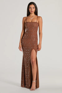 You'll be an utterly dazzling sight in the Britt rhinestone formal dress at weddings, banquets, or galas! She features a square neckline, adjustable spaghetti straps, padded bra cups, and a stunning mermaid silhouette, this dress is designed for an elegant and sophisticated look. The rhinestone mesh fabric adds a touch of glamour, while the front slit and floor-length hem provide an alluring finish. Complete the look with a clutch.