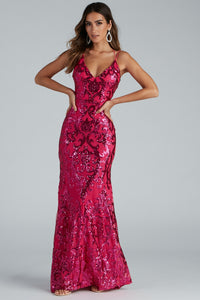Bring dazzle and shine to your evening with a prom dress that radiates elegance. The dress features a sleeveless V-neckline, sleek spaghetti straps, a multi-cross-strap design, sparkling sequins set in an intricate damask pattern, and a mermaid silhouette. The dress is composed of a lined mesh-knit fabric that offers a form-hugging fit with slight stretch. Complete your prom look with rhinestone heels and a clutch.