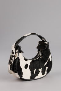 Western flair meets city cool. This cow-print pony hair mini purse brings bold texture and statement style in one petite package. Finished with sleek silver hardware and a curved handle, it’s the perfect piece to add a little yee-haw energy to your everyday looks.