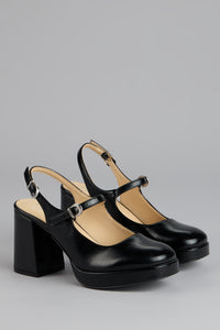 A classic with a twist—these slingback Mary Janes bring vintage vibes into the now with a block heel and sleek faux leather finish. Perfect with trousers, minis, or tights for that polished-cool look.