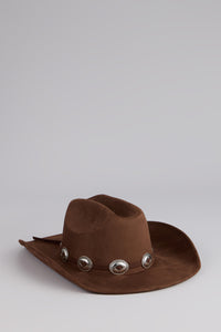Classic cowgirl with a polished twist. This faux suede cowboy hat features a wide brim and etched buckle trim, perfect for country nights, concerts, or adding a little western edge to your everyday fit.