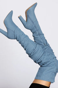 Channel your inner pop star with these over the knee denim boots! They feature a point toe, chunky block heel, a zipper closure, and a slouch effect. They are composed of a light washed denim. Definitely a fierce addition to your closet!Style Number/Barcode: 07402-0051