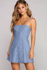 Your classic denim mini gets an of-the-moment upgrade with a sultry lattice front! Dress features adjustable spaghetti straps, V neck bodice with back zip, crisscross grommet-detailed tie front, and a curve-hugging pencil skirt. Dress is made from a lightweight cotton blend with a touch of stretch.Model is 5'7" with a 34" bust, 24" waist and 36" hips. She is wearing a size small.