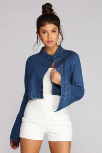 Layer your fave bodysuit or maxi with this of-the-moment cropped cotton denim jacket! Features an asymmetrical fold-over collar, covered front zipper, and dramatic bell sleeves. Jacket is made from pure cotton and offers minimal stretch.