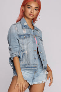 From cutoffs to rompers, top off your hottest looks with this classically cool denim jacket. Features a button-up front, all-over strategic distressed detailing, two flap pockets at chest, and welt pockets at waist. Jacket is made from a soft, cotton-denim blend with little to no stretch.