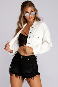 Look like a total dream in this cute denim cropped jacket! It features a collar, a drop shoulder with long sleeves with buttons to cuff, a complete button down front, and a cropped and frayed hem. The jacket is composed of a jean fabric and offers an oversize, relaxed fit.