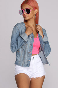 Add some chic edge to your look with this medium wash denim jacket! It features an unfinished edge rounded neckline, long sleeves with buttons to cuff, a complete button down front, top buttoned pockets, vertical seam detailing down the front, and a distressed and frayed hem. The jacket is composed of a jean fabric that offers no stretch.Model is 5'3" with a 32" bust, a 24.5" waist, and 35" hips. She is wearing a size small.
