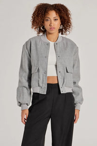 Give off that cool girl energy in this faux wool bomber jacket featuring long sleeves, a snap button-up front, and the perfect relaxed fit to layer. Style with a basic top and trouser pants!