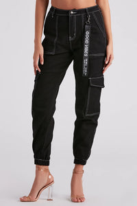 Functional fashion in a stylish utility design, these denim cargo joggers secure your must-haves while keeping your look edgy and cute! They feature a high-rise waist with a detachable good vibes keychain, a six-pocket styling, a jogger leg silhouette, and elasticized cuffs. Style with combat booties for a casual hang!