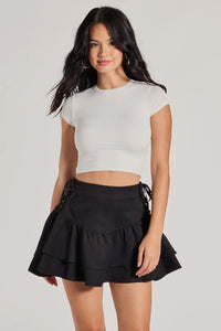 Impress with this sweet mini skirt featuring a flattering high-rise waist, side lace-up designs, and a tiered ruffled peplum style flared hem on woven fabric.