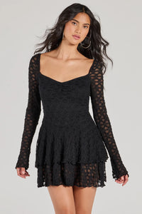 This lace romper features sheer fitted long sleeves, a tie-back design, and a flattering ruffled skater silhouette. Style with heels for any occasion.