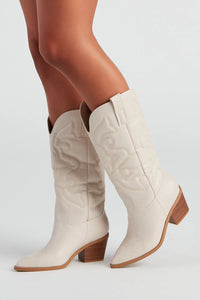 Get on that western trend with these of-the-moment cowboy boots! Featuring a below-the-knee height, a pointed toe, a short block heel, and a western-inspired embroidered design, these boots can be styled up or down. Pair with hoop earrings and a chic shoulder bag.